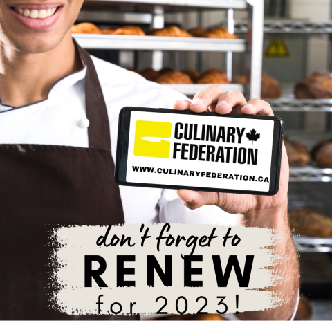 Renew now for the 2022 membership year, by logging into your member account at www.culinaryfederation.ca Need help? Contact Lisa at admin@culinaryfederation.ca